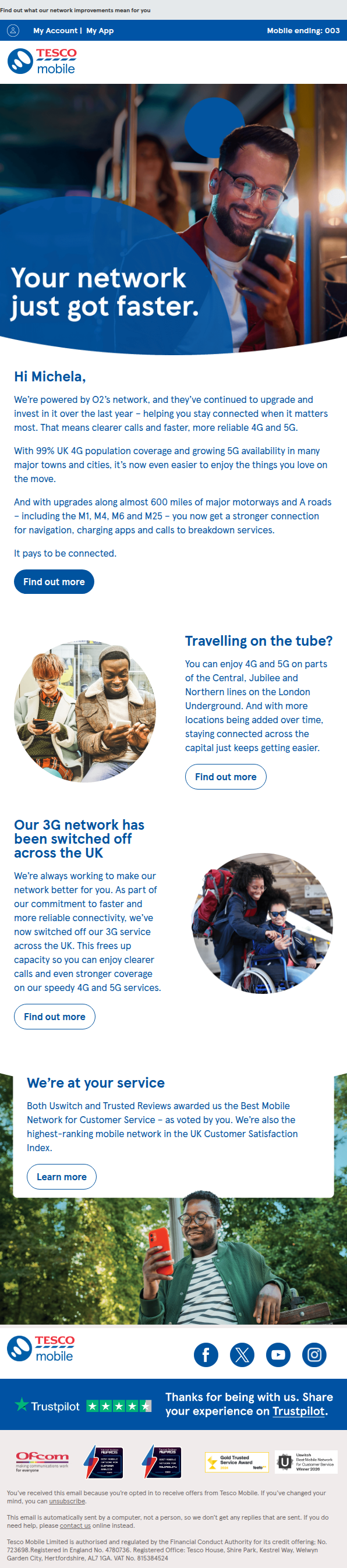 Ik heb een e‑mail die bedoeld was voor een groot deel van hun klanten gebouwd. De boodschap draaide om twee belangrijke punten: het netwerk was nog sneller geworden en klanten die nog 3G gebruikten werden geïnformeerd dat dit netwerk was uitgeschakeld.