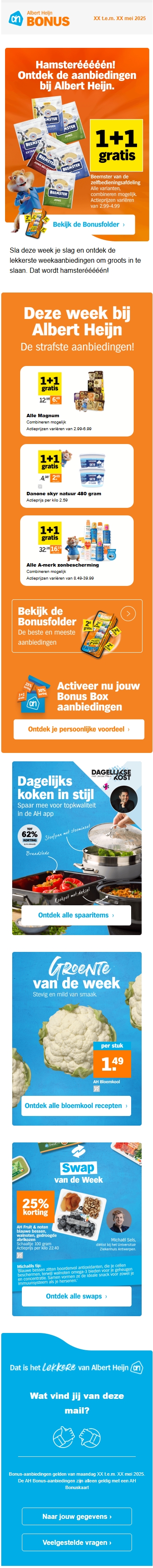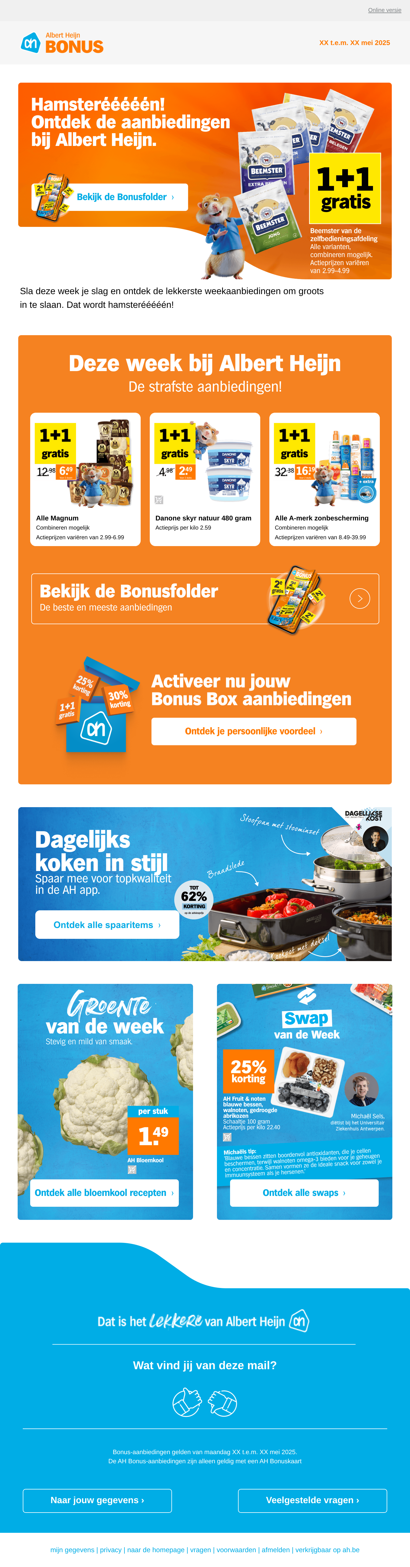 Ik werkte aan het bouwvan van de vernieuwde template voor de wekelijkse Bonus‑campagne. Het oude ontwerp sloot niet meer aan bij de huidige huisstijl dus kreeg het een volledige redesign. Het doel was om de look & feel van Albert Heijn België dichter bij die van Albert Heijn Nederland te brengen, met een moderne en strakke uitstraling als resultaat. Het bouwen van het template verliep zonder enig obstakel en de nieuwe structuur maakte het meteen een stuk toekomstbestendiger.