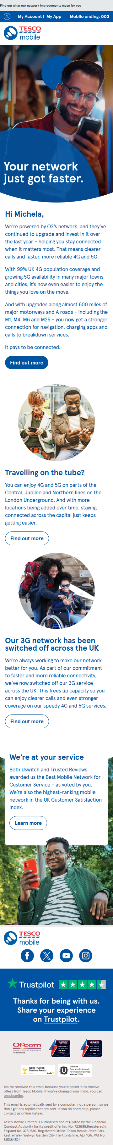 Ik heb een e‑mail die bedoeld was voor een groot deel van hun klanten gebouwd. De boodschap draaide om twee belangrijke punten: het netwerk was nog sneller geworden en klanten die nog 3G gebruikten werden geïnformeerd dat dit netwerk was uitgeschakeld.